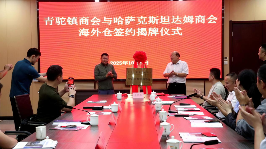 仪式上,双方代表就各自商会的发展历程、会员企业构成及对外贸易现状作了详细介绍。基于双方共同的合作愿景与互补优势,经过前期充分沟通与筹备,在与会嘉宾的共同见证下,双方代表正式签署了海外仓合作协议,并共同为海外仓揭牌,该海外仓将依托达姆商会在哈萨克斯坦的资源优势、信息优势等,为青驼镇企业、优质产品拓展中亚市场搭建便捷通道。